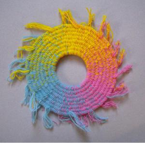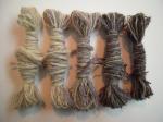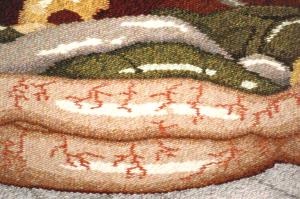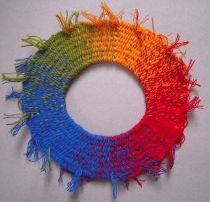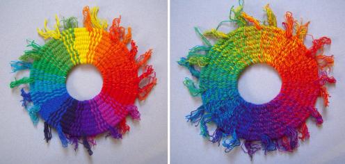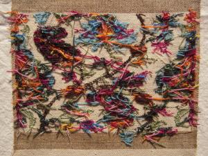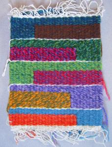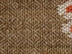 Sometimes it’s obvious that the weft threads are not the same thickness. Single-ply and two-ply wefts may be used, depending on the weaver’s stocks of the colours needed. Accents of strong colours such as black may be thinner for outlining, although their weaving-in follows the same instructions as other wefts. When the fabric is washed, or flexed and used, thick and thin threads will expand and collapse, making straight weft-wise lines hard to follow.