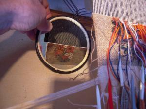 To look at the antique fabric, I am fortunate if I can start with a best-possible close-up photograph – carefully lighted and lined up on an improvised copy-stand – loaded into my image-editing program, where I can conveniently view it at magnifications up to 10x, the screen width of the fabric photo in nals. Careful lighting will help to distinguish colours, and sharp focus to settle questions. Printed photographs are rarely good enough.
