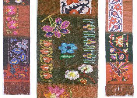 When Ellen and I travelled together to India in 1985-86, she had just graduated from the Ontario College of Art, and I had been weaving tapestries for several years, so both of us were keen to seek out Indian textile craft traditions. We encountered the best example of tapestryweaving in the first days of our trip, in Kashmir. I was left fascinated by the challenge of how to interpret design information given in line-by-line, stitch-by-stitch instructions, into tapestry images woven in a twill fabric, not just plain weave, and not to mention at 80 threads to the inch. It seemed that no Western observer, early or recent, had known enough about weaving to explain. The early ones shrugged it off as “loom embroidery”; more recently we can at least share the evidence of detailed photographs in the many opulent coffee-table books. I began to study the subject in earnest for an OCA course paper in 1990, casting around for descriptive accounts, and making practical experiments springing from my tapestryweaver’s expectations. At the same time, Kashmir’s ongoing struggle for some form of autonomy became more entrenched and dangerous. Given the few fragments of documentary evidence or useful comments, my knowledge of shawlweaving is largely self-taught and reverse-engineered, to discover how to get to the resulting fabric. Popular interest in the historic paisley or Kashmir shawl has provided me many opportunities for published articles and talks.