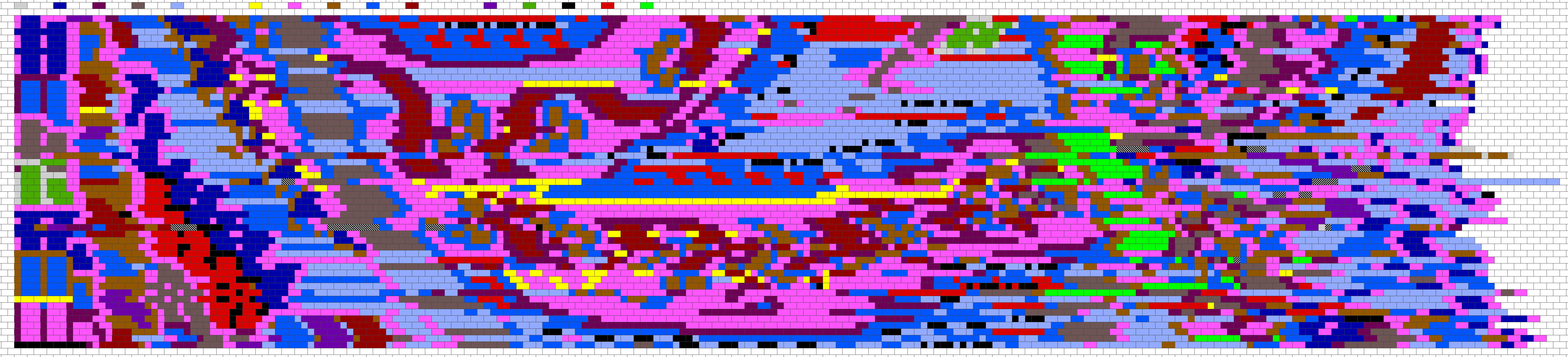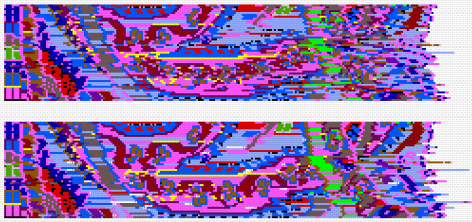 The illustration with two drafts shows the recent draft with my new interpretation of “two-halves” number symbols at the top, and, at the bottom, the result of portions of lines shifted simply by eye to try to bring them into alignment with lines above and below. To this point I haven’t gone back to the talim text to see if my nips and tucks corresponded to unclear text symbols. (Each “brick” unit of the grid represents a nal, two raised warp threads and two lowered, and two picks of weaving.)