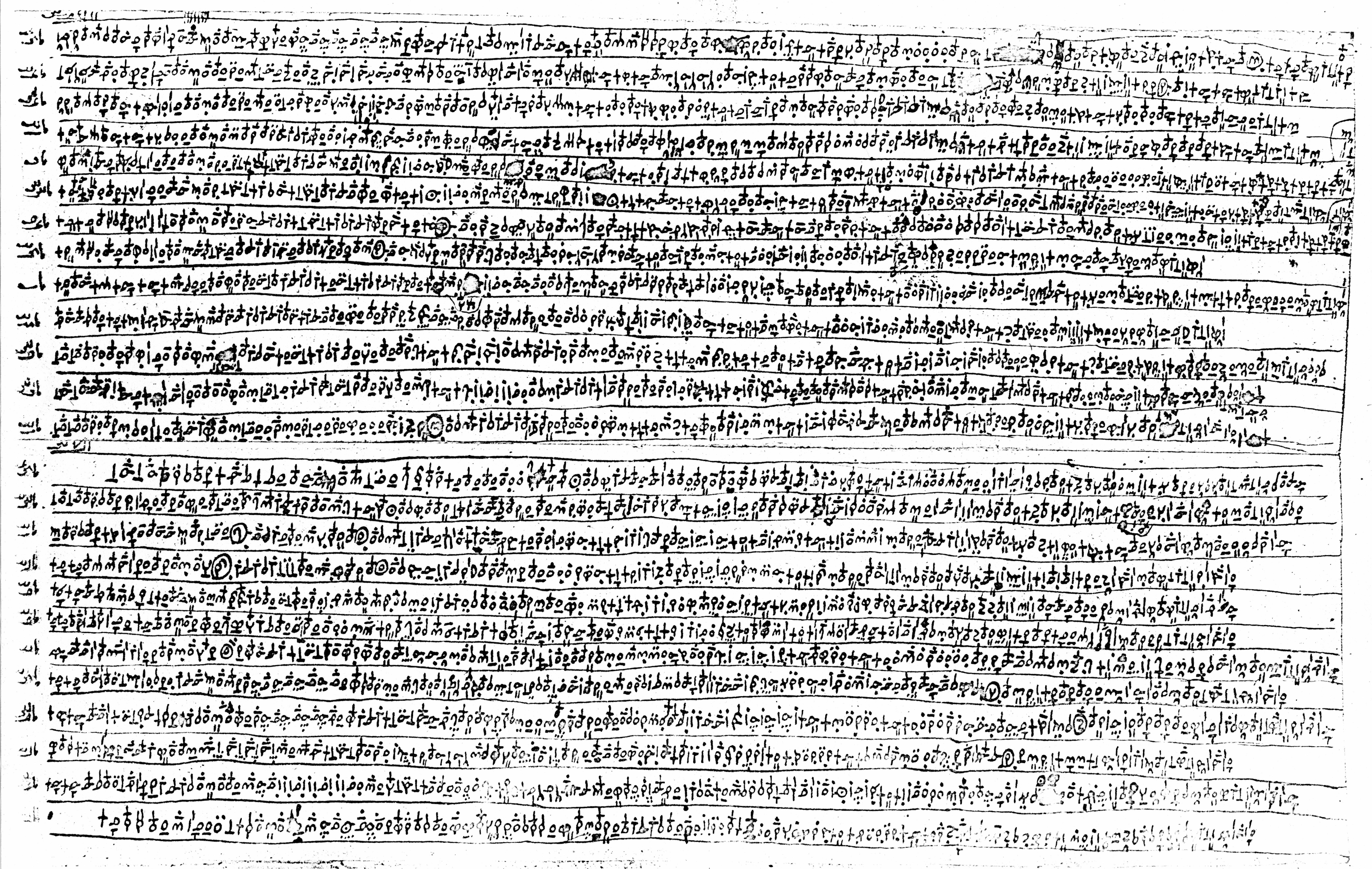 So I finally set about drafting a new diagram from the talim text according to this newer interpretation of the many instances of “two-halves” symbols. I began with approximately 60 nals at the start (left-hand end) of each talim line, and was encouraged to go on and add another 60 of each, still less than half of the total line length of about 300 nals. At that point I gave up the idea of continuing, because the design still seemed to be breaking up due to accumulated errors.