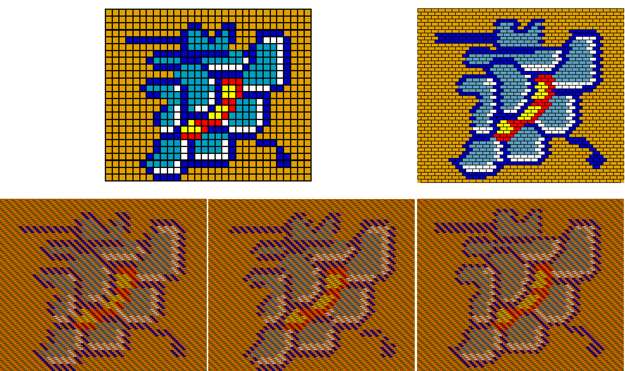A major improvement in the appearance of the woven motif will result if the line of instructions for the 3rd and 4th picks of the weave-unit is carefully edited for the best placement of those stitches, even without introducing new colours or bobbins. This process takes place at the design stage, and is based on representing each row of a square-grid design by two rows of brick-grid units that show the diagonal progression of the twill fabric stitches. Each brick-grid unit, representing two stitches, can be assigned the same colour as an adjoining unit in the same row, either right or left, to produce a clearer design or smoother outline, without requiring more bobbins. It is true that the talim line of instructions for the 3rd and 4th picks is different from the line for the 1st and 2nd picks.