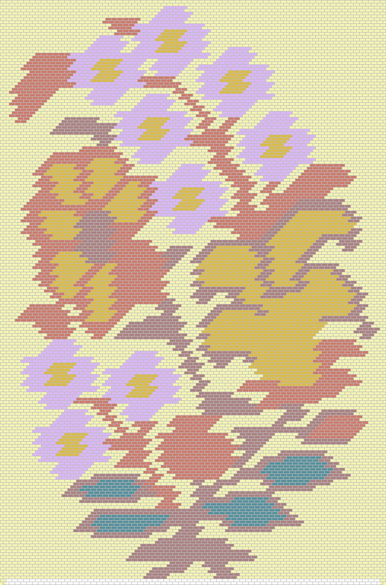 The twill fabric structure of shawlweaving consists of weave-units of 4 warp threads and 4 weft threads. At each treadling 2 adjacent warp threads (called a “nal”) are raised, two lowered, and 1 weft thread (or pick) is passed between. The raised warp threads may be named in this sequence as: 1 and 4, 1 and 2, 2 and 3, 3 and 4, and then the sequence is repeated. While it is true that the whole weave-units, each consisting of 4 by 4 threads, align in straight rows and columns, so they can be represented by the square grid, they are different in two important respects from the single carpet knot. Each weave-unit shows 4 stitches (or “seeds”, a tapestryweaving term) of the weft thread, in the colours of the design, and these 4 stitches line up in a diagonal row. So each weave-unit is more detailed, and has a peculiar diagonal orientation, that the square grid does not show.
