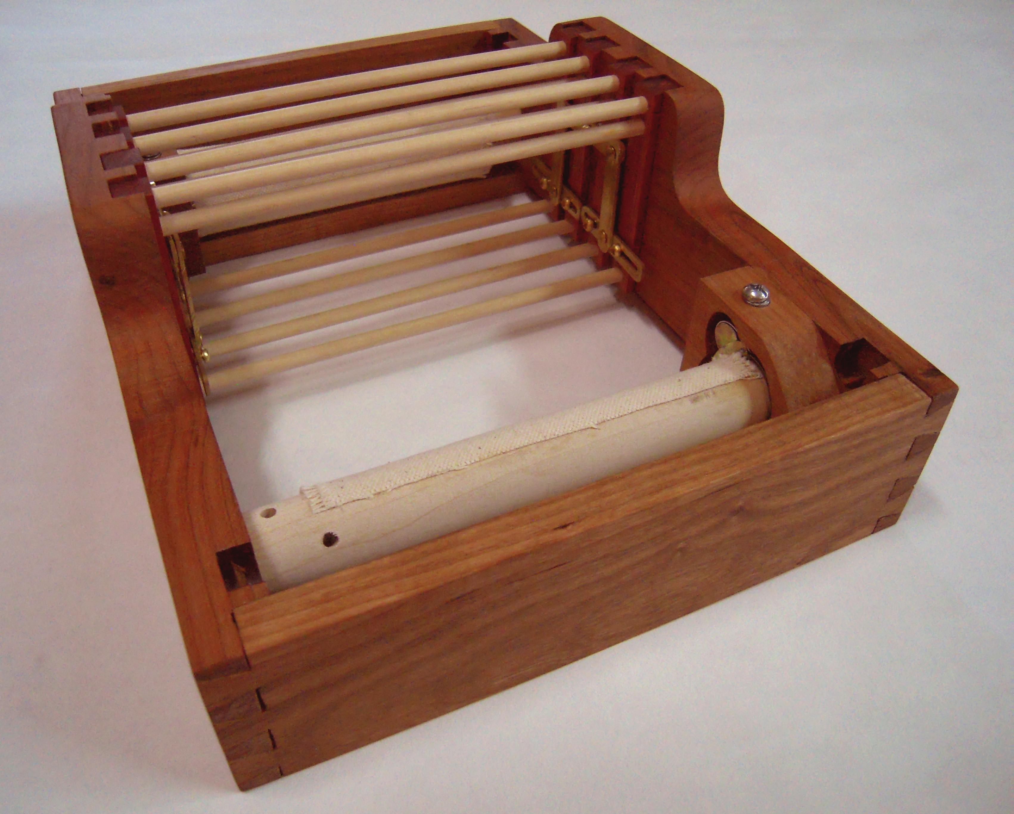 At one end of each roller is a pipe clamp held in an elaborate wood bracket glued to the side panel, to grip the roller tightly in any position. At the other end of the roller is a series of holes for inserting a lever to advance and tension the warp threads. The pipe-clamp installation grew to seem overly delicate and fussy as construction proceeded – it may require improvement.