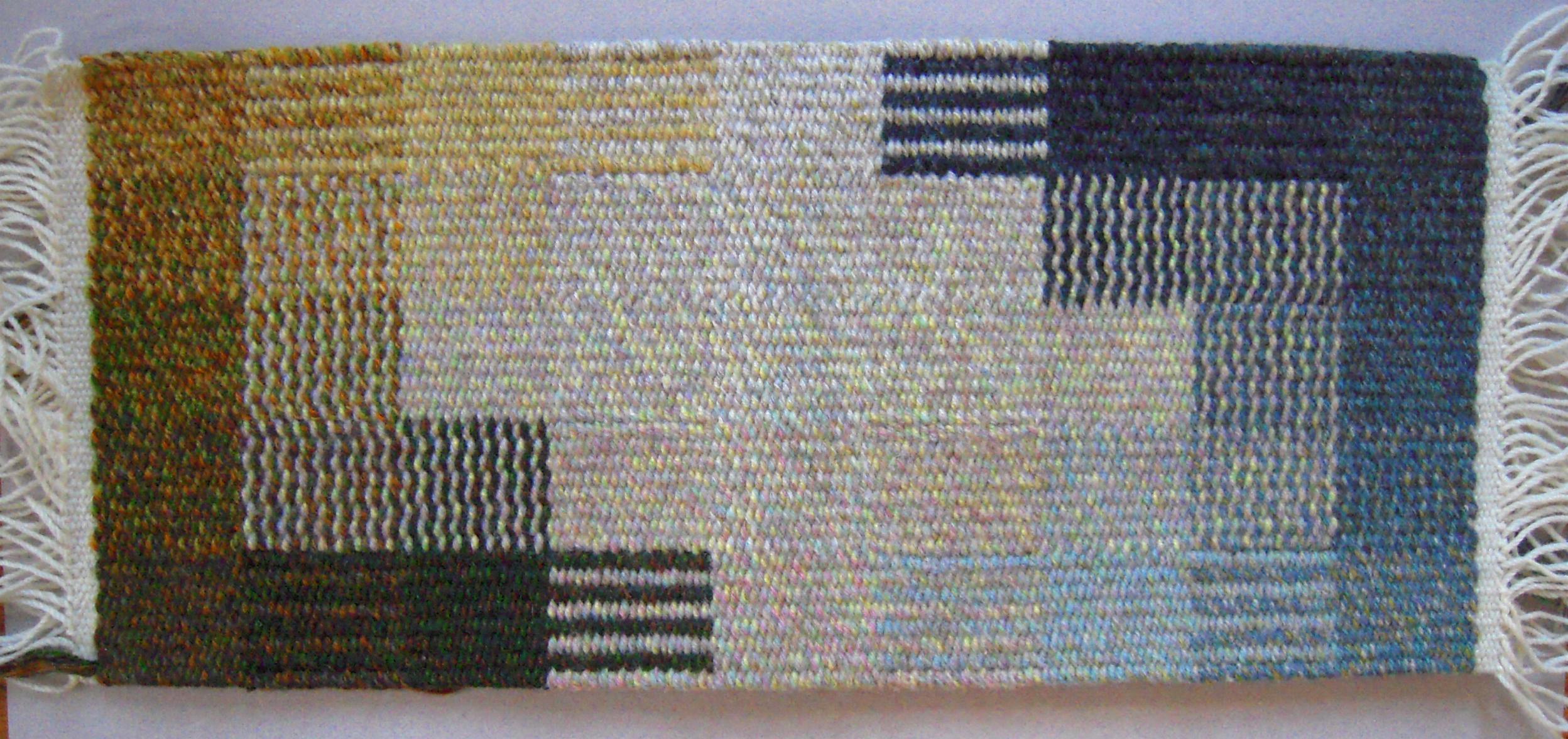 One yarn in common can link all the weft shades of an object or lighting situation. Often I must pause at a new stage in weaving a project, to compose a connected range of weft shades, adding and dropping the transitional colours. The number of changed yarns necessary to distinguish tone steps may vary depending on yarn similarities and contrast ranges within the mixtures.