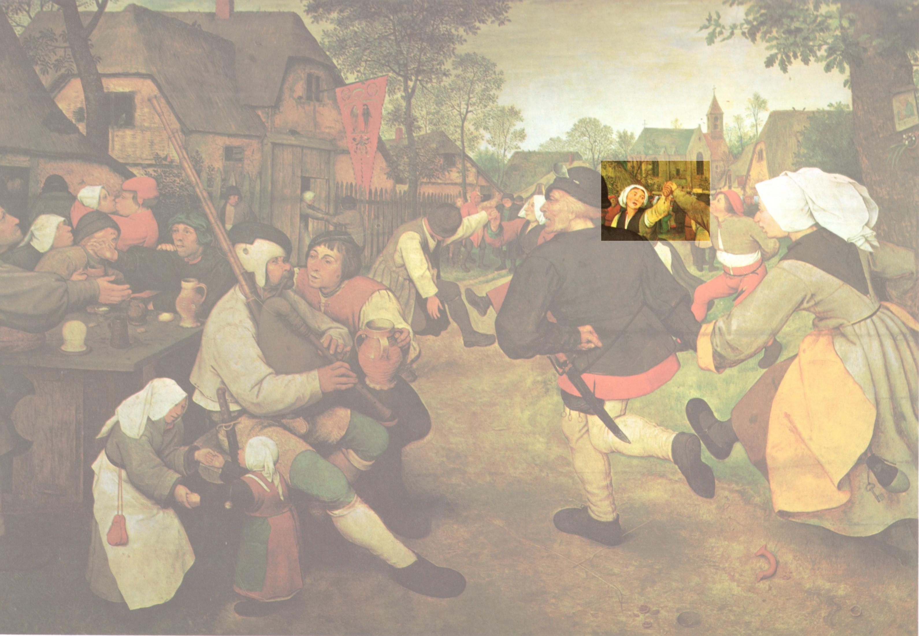 Nevermind the anatomical difficulties also present. A friend objected that her curled fingertips should point toward her wrist, and her index finger (if that’s what it is) is probably dislocated. Some other Bruegel people show signs of being patched together from separate life-drawing studies.