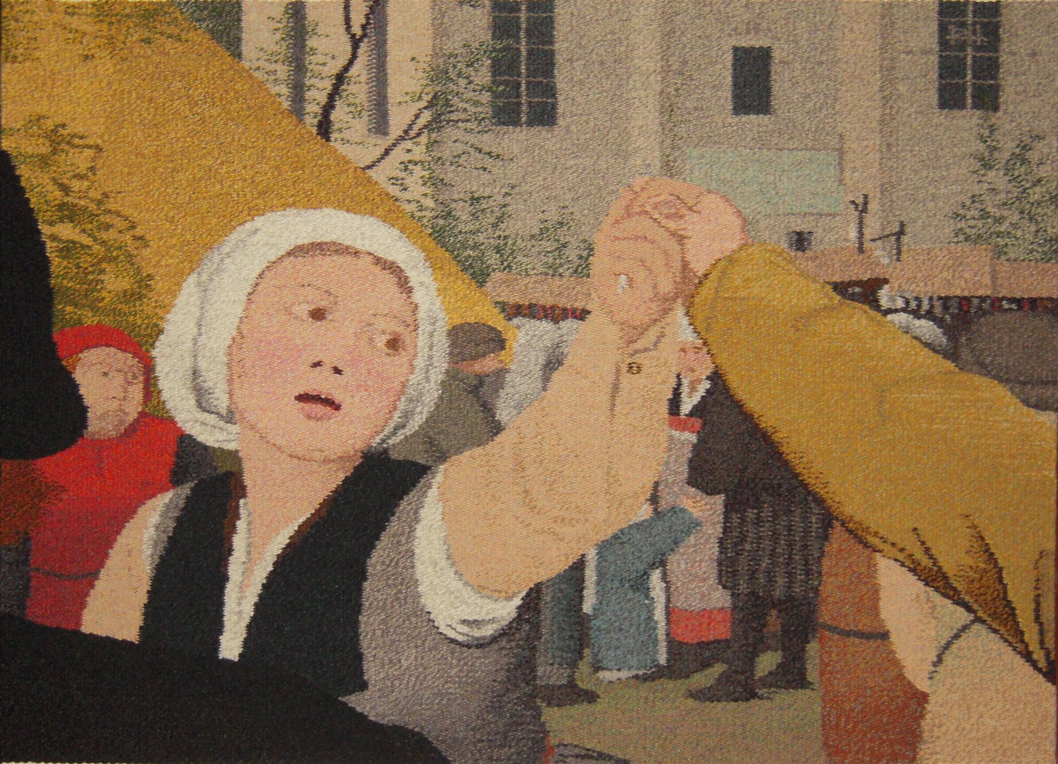 For an artist whose work was collected during his lifetime, his surviving oeuvre is surprisingly small, and shows him turning to several popular genres – landscapes, Classical and Biblical stories, months, caricatures of everyday life. “The Village Kermis” (a fair in support of the local church) also known as “The Peasant Dance” that my tapestry project is taken from, is one of just two or three paintings, from the last years of his life, with eye-level perspective and “monumental Italianate” figures. I picked it for the volumes and gestures of its figures, the magnified three-dimensionality of the space, and the open face of the young woman.